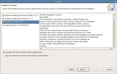 Accept License AgreementsIn addition to the SAnToS Academic License to which you must agree in order to download and use Cadena, the Eclipse Foundation has its own open-source license which applies to any features from Eclipse. Other library dependencies of Cadena which we bundle in the Cadena core distribution feature also impose their own license terms. The Feature License screen presents all of these documents. Please read through all of these terms of agreement and, after you are familiar with them to your satisfaction, click Next. |