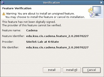 Unsigned JAR WarningWhile installing the Cadena feature, you may be prompted by a warning which reports that no encryption signature has been used to certify its authenticity. You should still allow installation to proceed despite this condition by clicking Install All. |