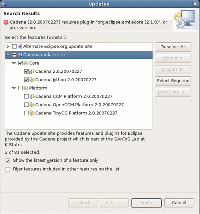 Select Cadena distributionOnce the Update Manager has completed it inspection of the specified update sites it will provide you a list of available features and plugins to install. This is displayed in the Search Results dialog. By expanding the tree, you can view all of the software available on the Cadena update site. The Core category will always contain the most recent release of Cadena. It may also include other milestone releases of particular noteworthiness and other extensions to the core platform. The Platforms category contains releases of platform extensions to Cadena (the platforms shown will likely include CCM, OpenCCM, and TinyOS). Choose Cadena (the current release may be more current than the screen capture pictured). Optionally, you may also select any other extensions or platforms to install as well. Note: Eclipse may require several seconds to process the expansion of a site or category or the selection of a feature. When this happens, the Update Manager downloads and inspects the JAR files providing the sites/features as soon as they are selected. Please be patient and wait for the user interface to again be responsive. After selecting these checkboxes, you may notice that the Update Manager reports that Cadena cannot be installed because features Cadena depends are not installed. The next step will fix this by selecting required features. |