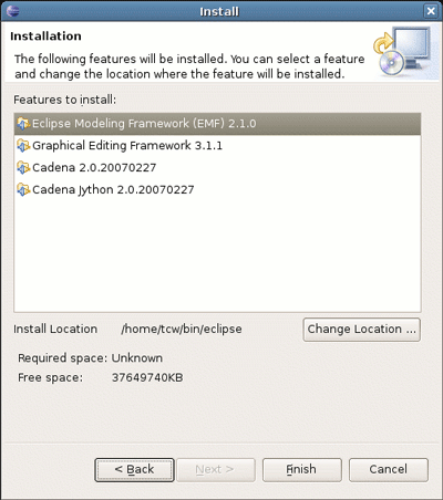 Add DependenciesCadena depends on a few features (including GEF and EMF) to be installed before it can be used. If these features are not installed, the Update Manager will display a warning. To install these required features along with the Cadena installation, click on the Select Required button. This will automatically select all of the necessary features. Note: due to a bug in the current release of Eclipse (3.1.2), it may be necessary to "prime" the feature list by expanding the Eclipse.org item before clicking the Select Required button. Otherwise, the required features will not be included in the selection. After selecting those features you wish to install, click Next to move on. Before moving on you should ensure that you have the following features selected to be installed: