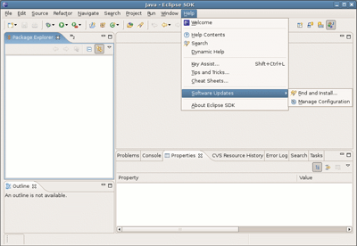 Launch the Update ManagerEclipse features an elegant mechanism for installing new plug-ins: the Update Manager. By configuring third-party websites as known sources of new software inside the Update Manager, you can allow Eclipse to manage the dependencies, downloading, unpacking, and installation of these sets of packages (called features). Open the Update Manager's dialog to install new features by choosing Help -> Software Update -> Find and Install... from the main menu. |