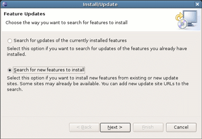 The Update Manager can, in addition to downloading new packages, also search for upgrades to already-installed features. For now, choose Search for new features to install in the dialog that appears. The other option (Search for updates to the currently installed features) can be used to update to the latest release of Cadena if you already have a previous version of our Eclipse feature installed. |